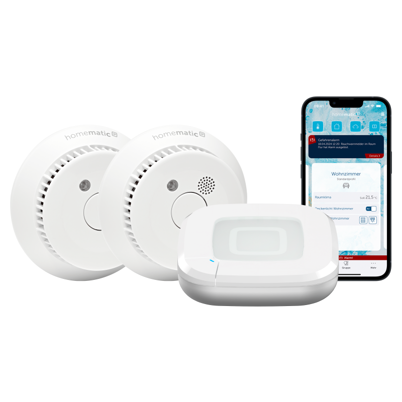 Die smarten Rauchwarnmelder im Homematic IP Starter Set informieren frühzeitig über ein unbemerktes Feuer. Zuhause meldet sich die lautstarke Sirene, zusätzlich wird von überall eine Push-Nachricht in der App versendet.