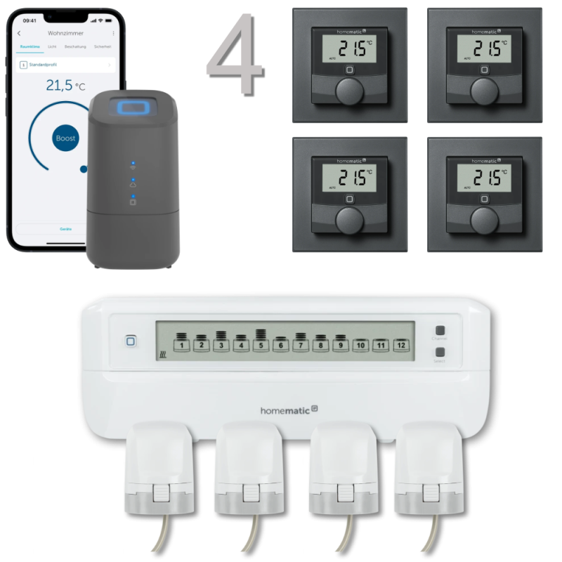 • Smarte Komplettlösung für die Steuerung der Fußbodenheizung in 4 Räumen – beliebig um weitere Räume und Funktionen mit weiteren Homematic IP Geräten erweiterbar