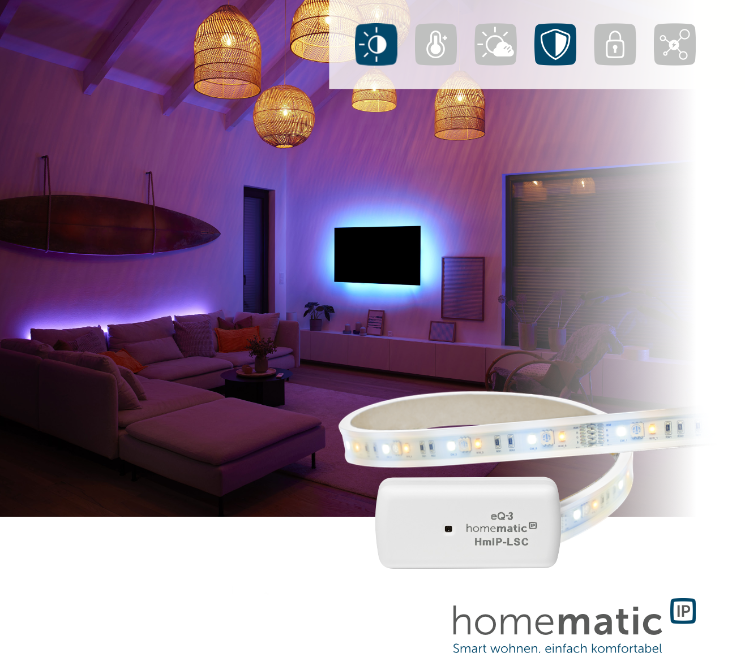 Smartes Highlight Neben der dekorativen Beleuchtung kann der Lightstrip auch als Signallicht in Smart-Home-Szenarien eingesetzt werden, beispielsweise zur optischen Alarmanzeige. In Verbindung mit weiteren Homematic IP Komponenten lassen sich so komfortable und intelligente Lichtlösungen realisieren.