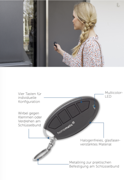 Die Homematic IP Schlüsselbundfernbedienung – 4 Tasten erleichtert das Nach-Hause-Kommen. Mit ihrer besonders großen Funk-Reichweite kann die Außenbeleuchtung gesteuert, das Garagentor geöffnet und sogar im Haus das Flurlicht eingeschaltet werden.