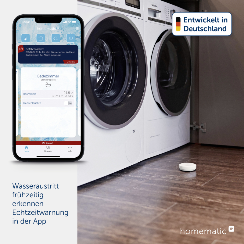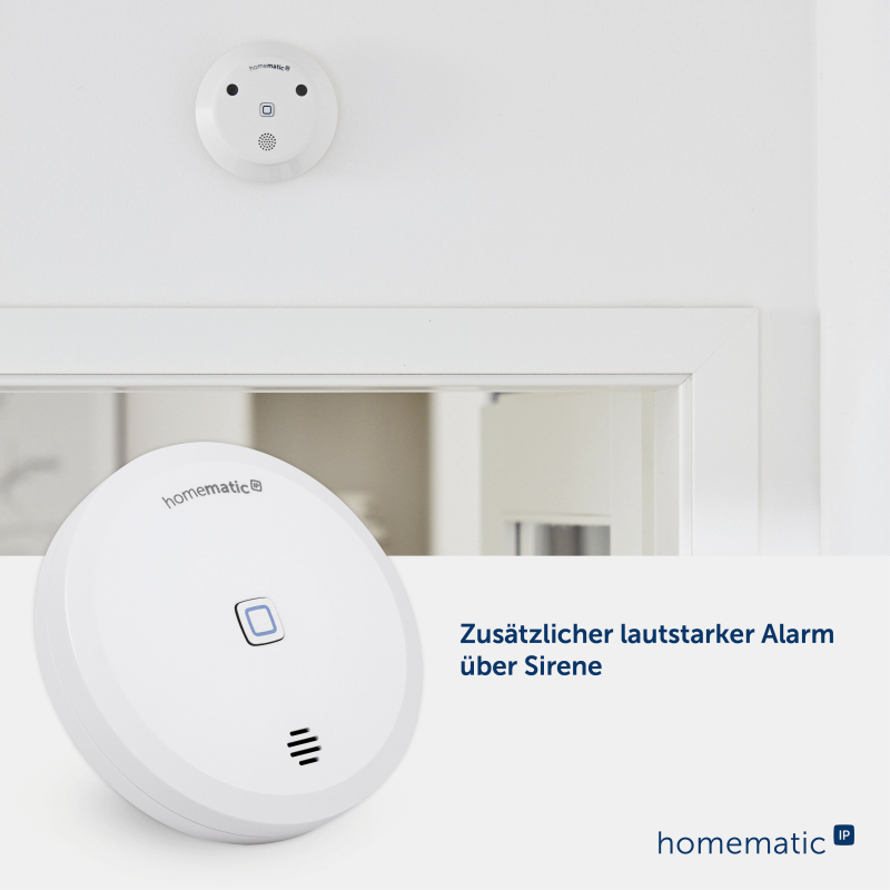 Bei erkannter Feuchtigkeit werden Sie im Homematic IP Smart-Home-System nicht nur per App informiert, sondern können auch Sirenen oder vernetzte Rauchwarnmelder automatisch auslösen lassen. So werden Sie im Ernstfall im gesamten Zuhause zuverlässig gewarnt.